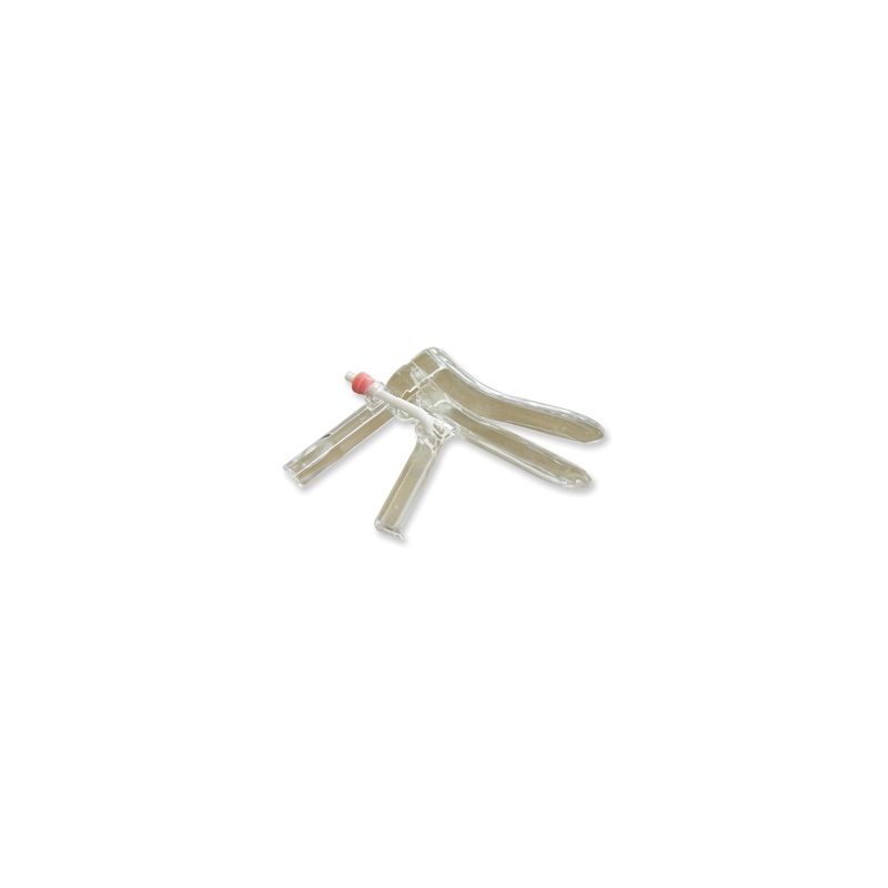 Einweg-Vaginal-Spekulum mit allmählicher seitlicher Justierschraube, aus transparentem atoxischen Kunststoff und Vakuum verpackt in transparentem Material.