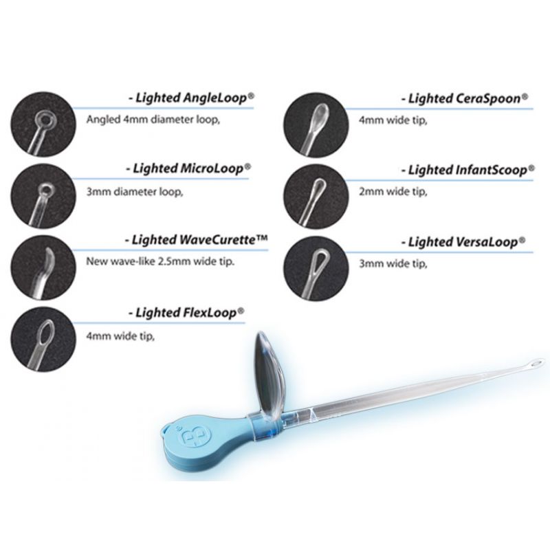 kit is composed by 50 lighted curettes (8 flexloop and 7 of each of below other 6 tip styles) + LED illuminator + magnification lens.