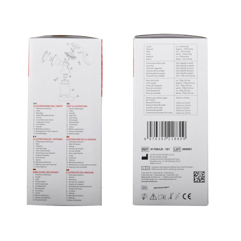 Supplied with breast shield, nipple with cover, milk bottle with lid, multilanguage manual (GB, FR, IT, ES).