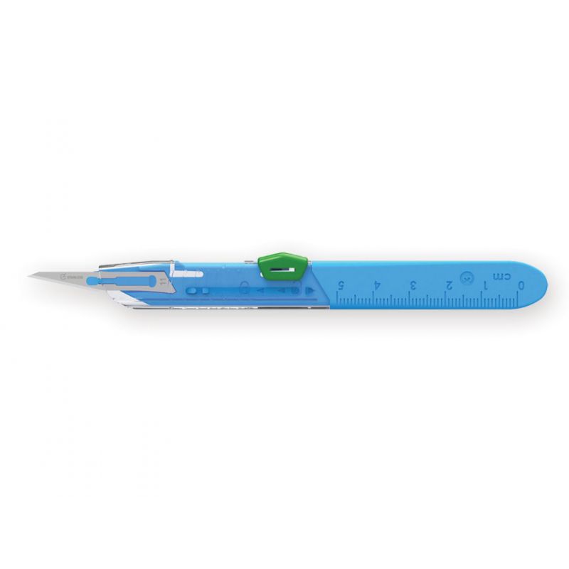 SAFETY protective shield SCALPELS: protective scalpels with a clear view shield that protects against injures before use, between steps of procedure and after disposal.