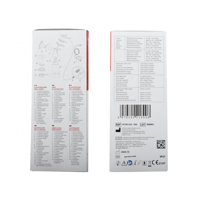 Supplied with breast shield, nipple with cover, milk bottle with lid, multilanguage manual (GB, FR, IT, ES).