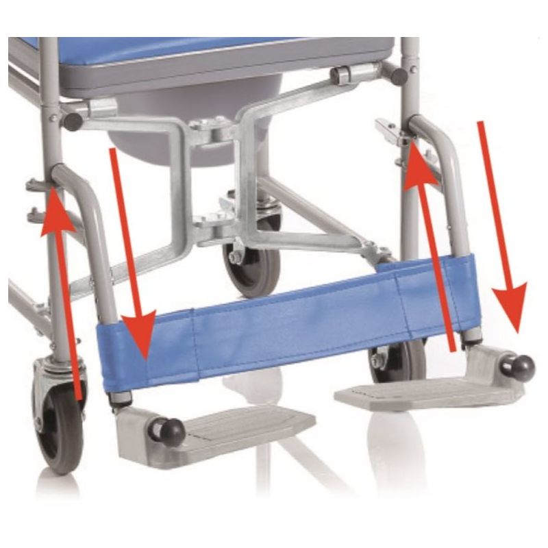 Folding and height-adjustable footrests, toe strap, 4 swivel wheels, 2 of which with brake.