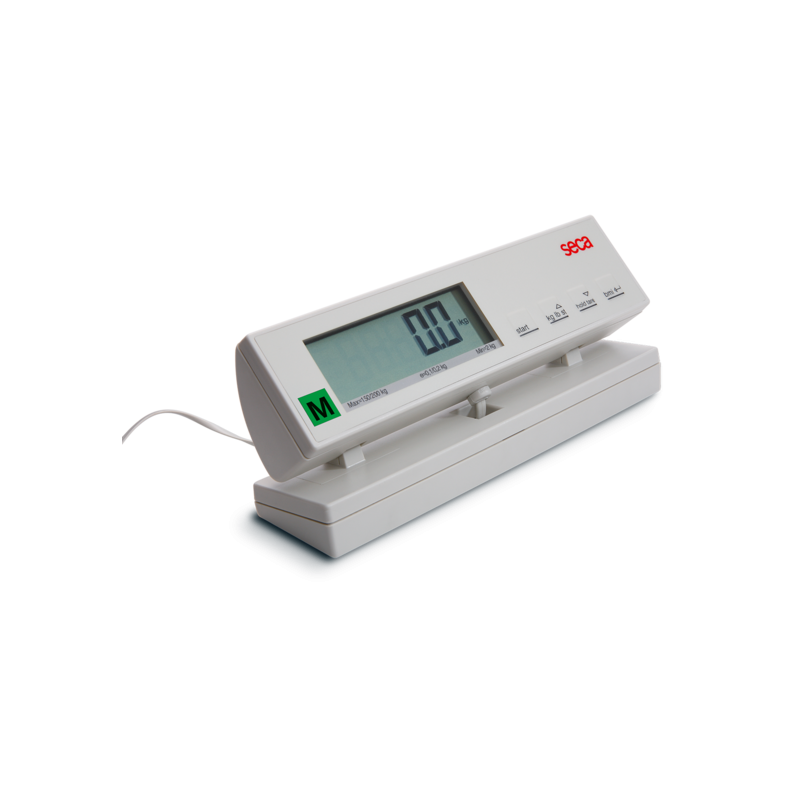 A 2 m cable connects the display with the weighing base. Advantage: the display can be set up separately from the base and read from its position on the wall or desk suitable for weighing school children and other healthcare applications. Additional convenience is supplied by the many extra weighing functions: BMI for nutritional conditions, HOLD to keep measurements displayed and TARE for weighing small children held in an adult's arms. It is suitable for stationary or mobile use thanks to its handle, compact size, low weight and a leveling base for set-up on all types of surfaces.