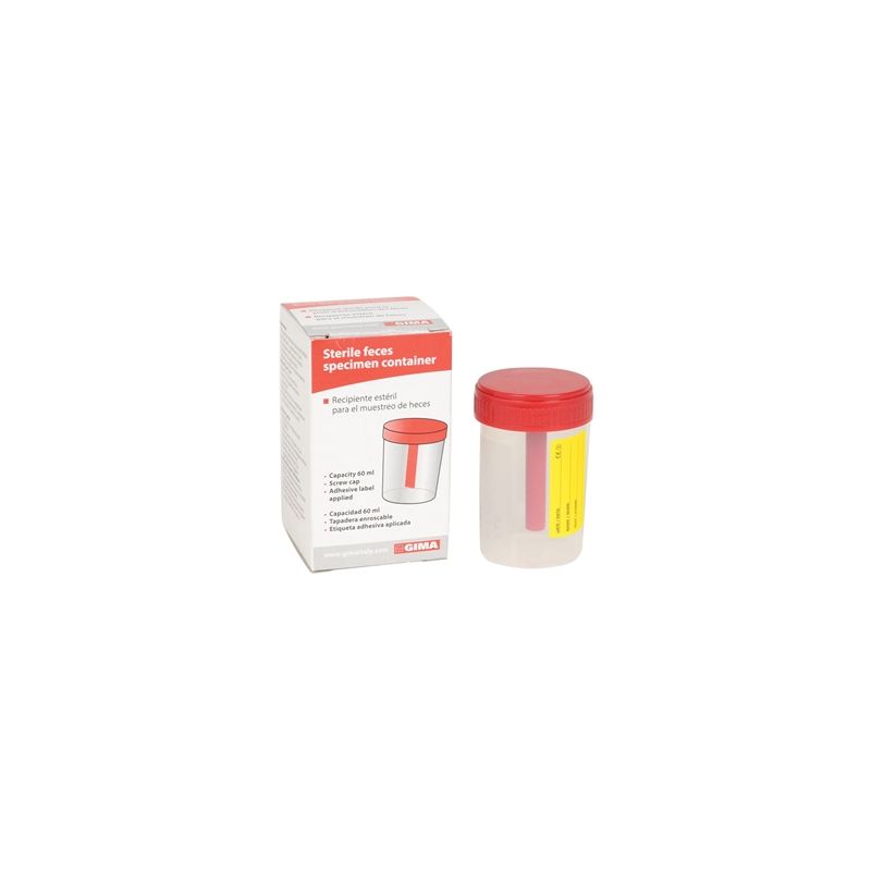 Recipiente biológico estéril para heces de 60 ml en poliestireno cristal de alta resistencia.