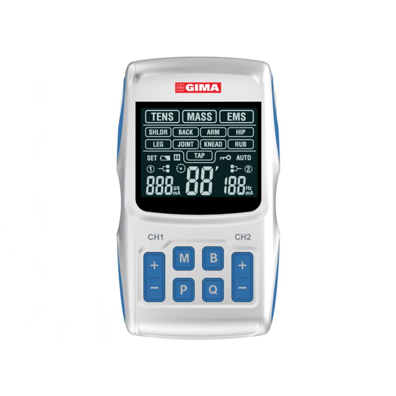 Gima-Ther es un estimulador de dos canales con 3 funciones básicas: TENS, EMS y MASAJE.