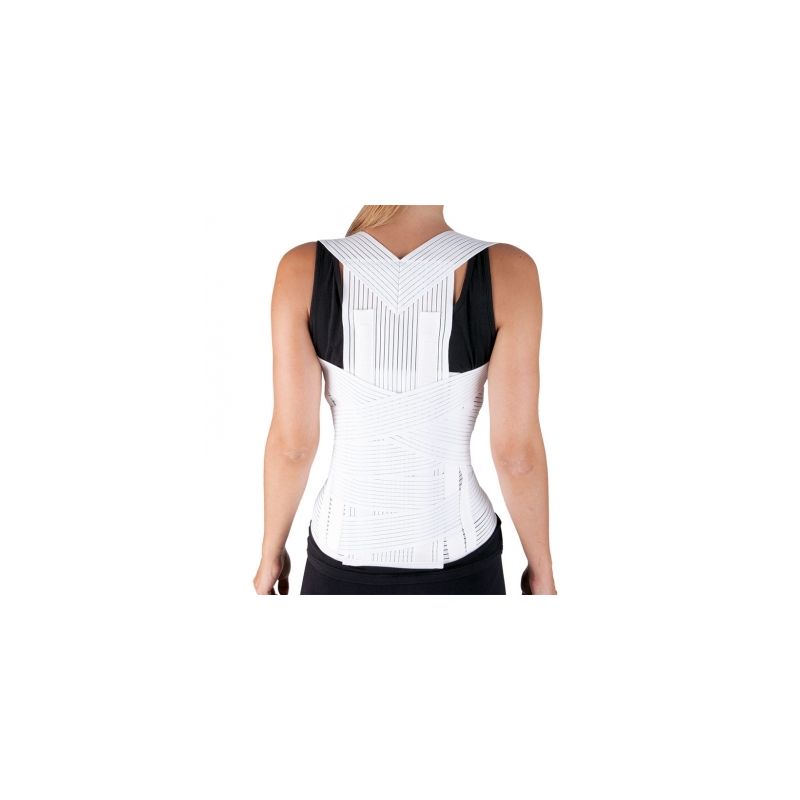Alto corsé en tejido acanalado ventilado con correas de hombro con dos férulas dorsolumbares y dos tacos lumbares de aluminio que se pueden adaptar a la morfología del paciente.