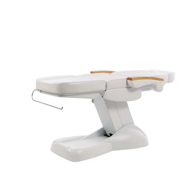 Sillón de estética de 3 cuerpos con 3 motores que controlan la altura, la inclinación del respaldo y del reposapiés. Reposabrazos abatibles y apoyacabezas regulable con agujero facial. Disponible también con 4 motores (modelo WKE015.4.A26) que permiten la regulación motorizada del asiento. Tapizado blanco en PVC y fácil de limpiar. Portarrollos incluido.