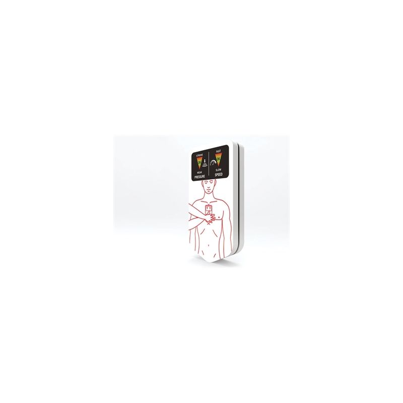 Le dispositif comprend des indicateurs lumineux qui indiquent au secouriste la bonne pression et la bonne fréquence des comprimés.