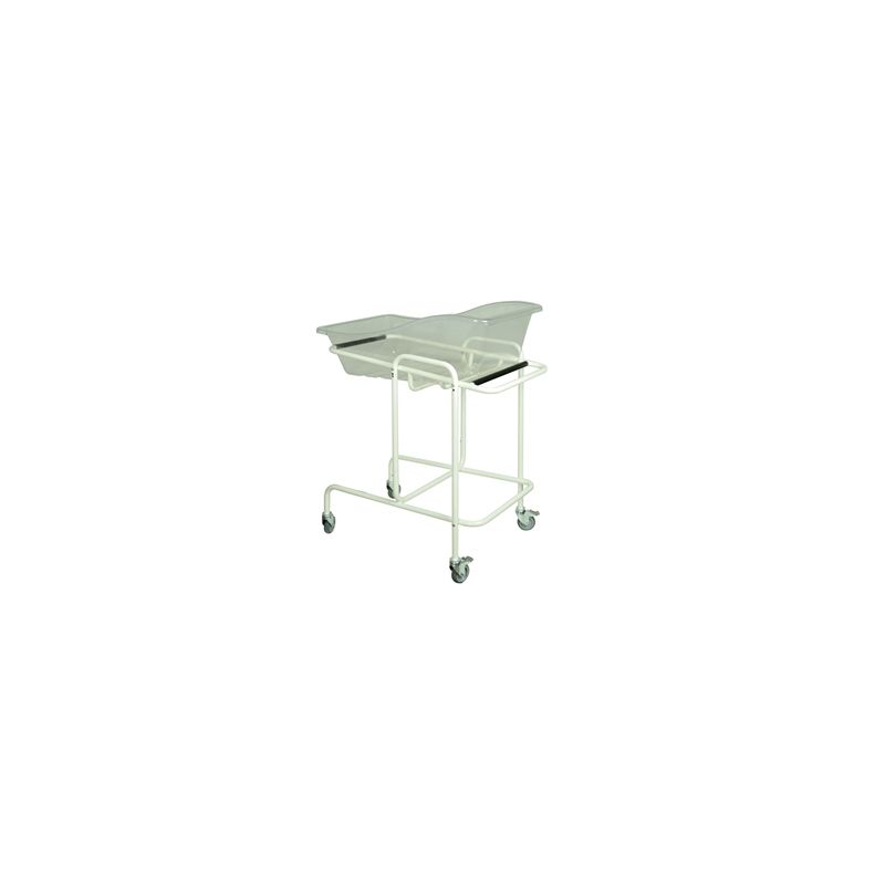 Lit bébé avec voiture en matière plastique neutre transparent et incassable avec des bords courbés et avec des trous d'air. Structure de tuyaux en acier laminé à froid avec peinture en poudre.