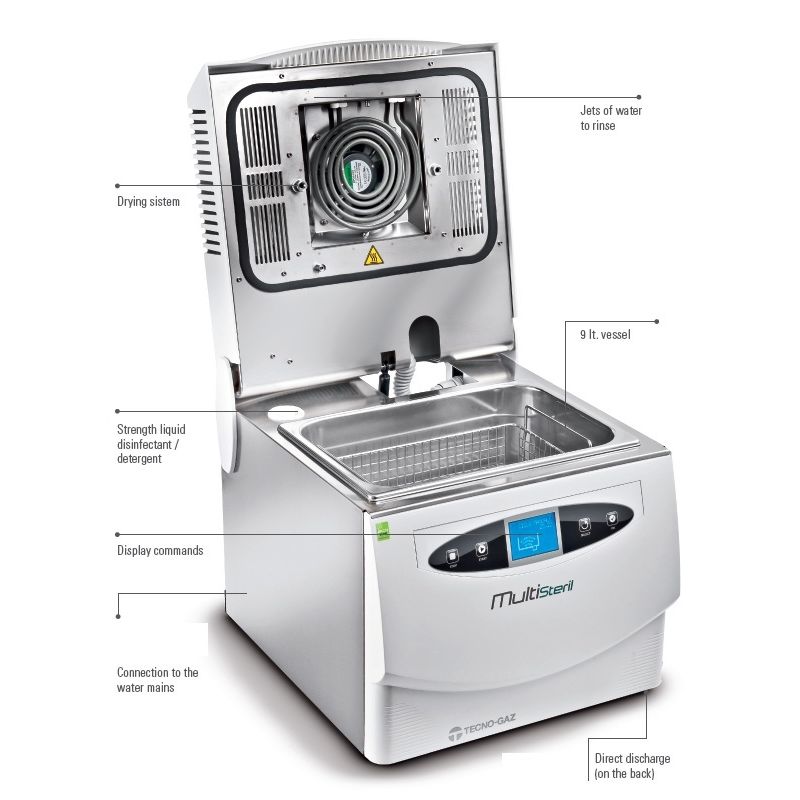 Tecno-Gaz a créé un nouvel appareil révolutionnaire capable de développer automatiquement les principales étapes de préparation du cycle de stérilisation : désinfection, détérioration, rinçage et séchage.
