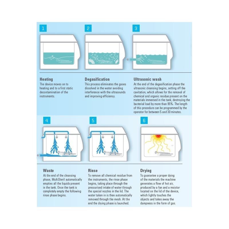La manipulation d'instruments et de matériaux potentiellement infectés est un facteur très important qui doit être maintenu sous contrôle strict, à la fois pour protéger les opérateurs et la responsabilité du titulaire de la clinique. Multisteril élimine ce risque.