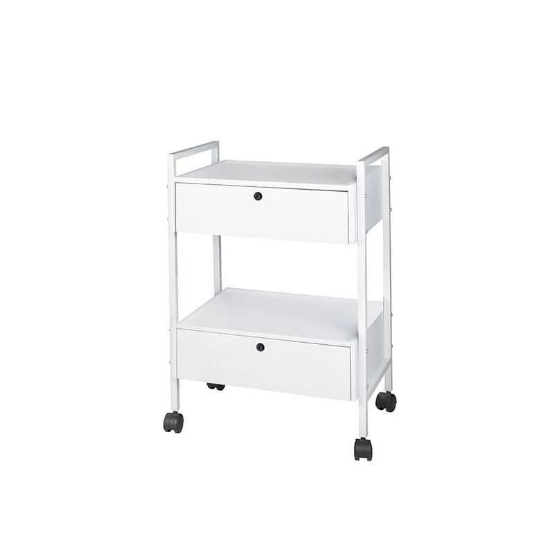 Cadre métallique de couleur blanche avec 2 étagères et 2 tiroirs clés conçus pour accueillir des dispositifs d'enveloppe ou stocker plusieurs accessoires de centre de beauté.