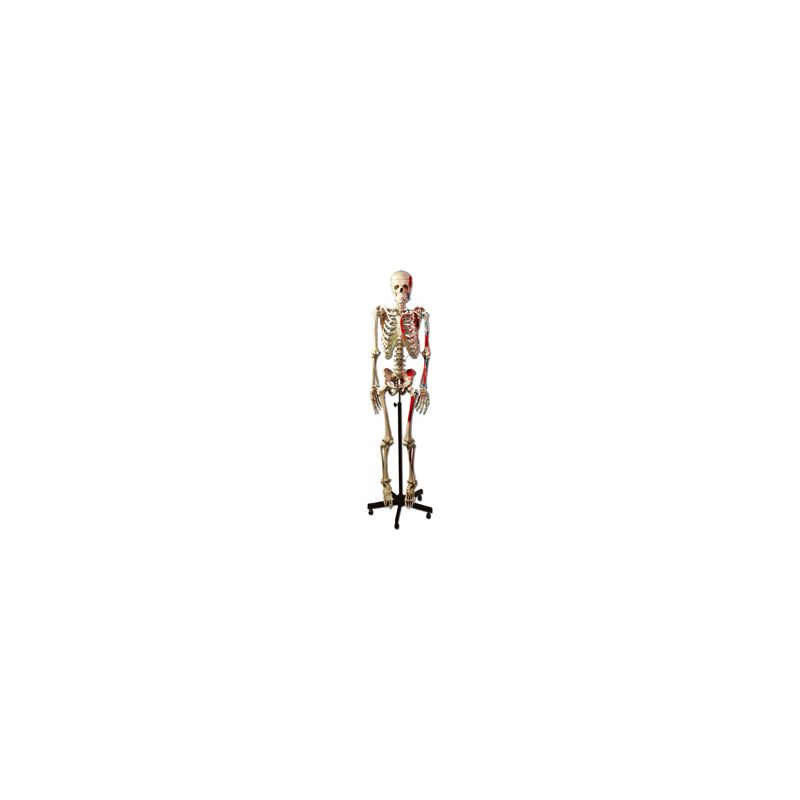 Het linker deel van het skelet draagt de punten van oorsprong en insertie van de spieren.