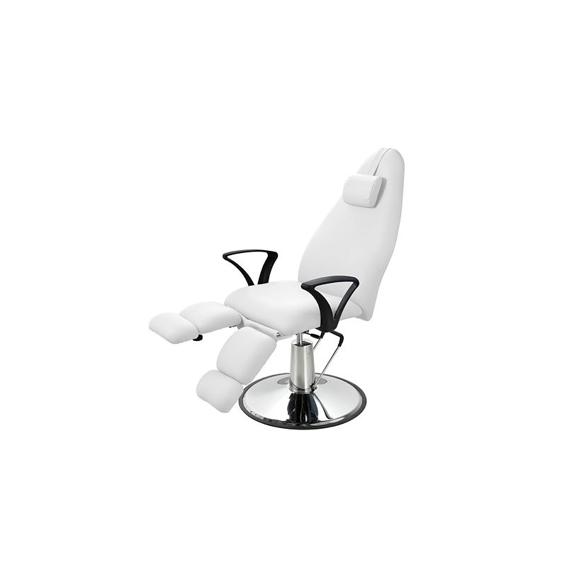 Rotary podologie stoel met chrome basis. Hydraulische pomp aangepast lengte met sluitingssysteem. Armrest en been lengte onafhankelijk aangepast met gaspiston. Gescheurd in witte PVC zonder hoge kwaliteit naden en makkelijk schoon te maken.