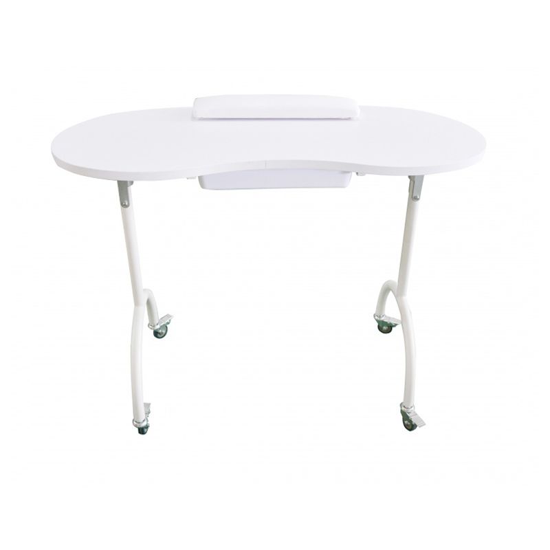Bevrijdbaar en vouwende manicuretafel uitgerust met stofzuiger en twee wielen met slotsysteem.