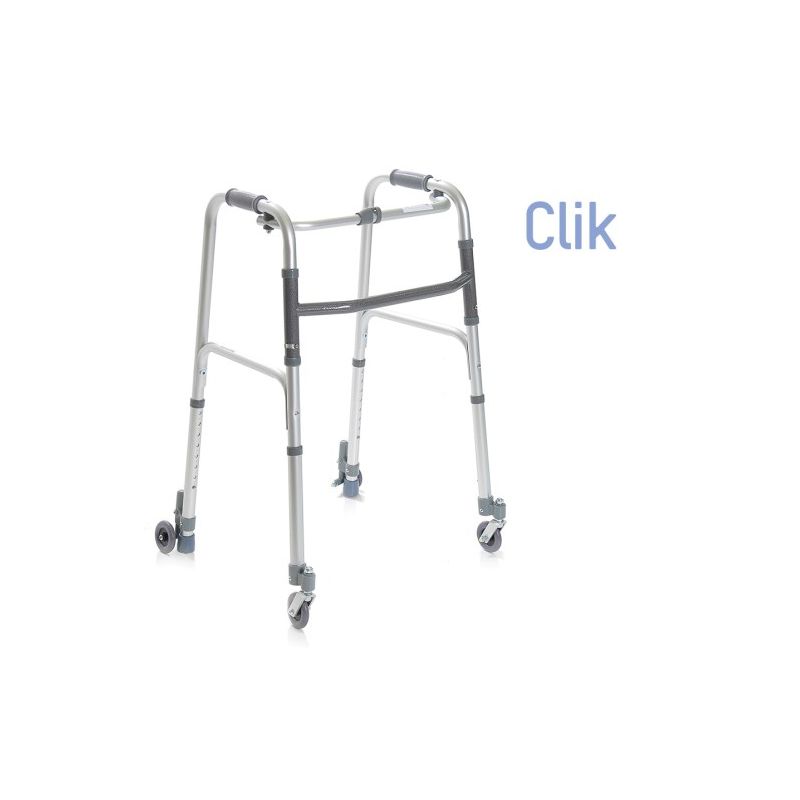 Folding walker gebouwd in geïmodeerde aluminium met 2 pivoting wielen en 2 wielen met auto-lock systeem