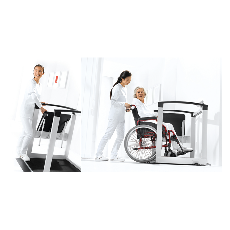 De patiënt kan zich aan de leuning vasthouden terwijl hij op de geïntegreerde, opklapbare zitting zit of met de rolstoel op het grote platform klimt.