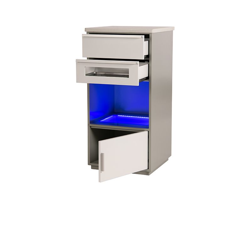 Meerdere meubels van grijs hout met kwarts oppervlak en beige resin. Met UV lade.