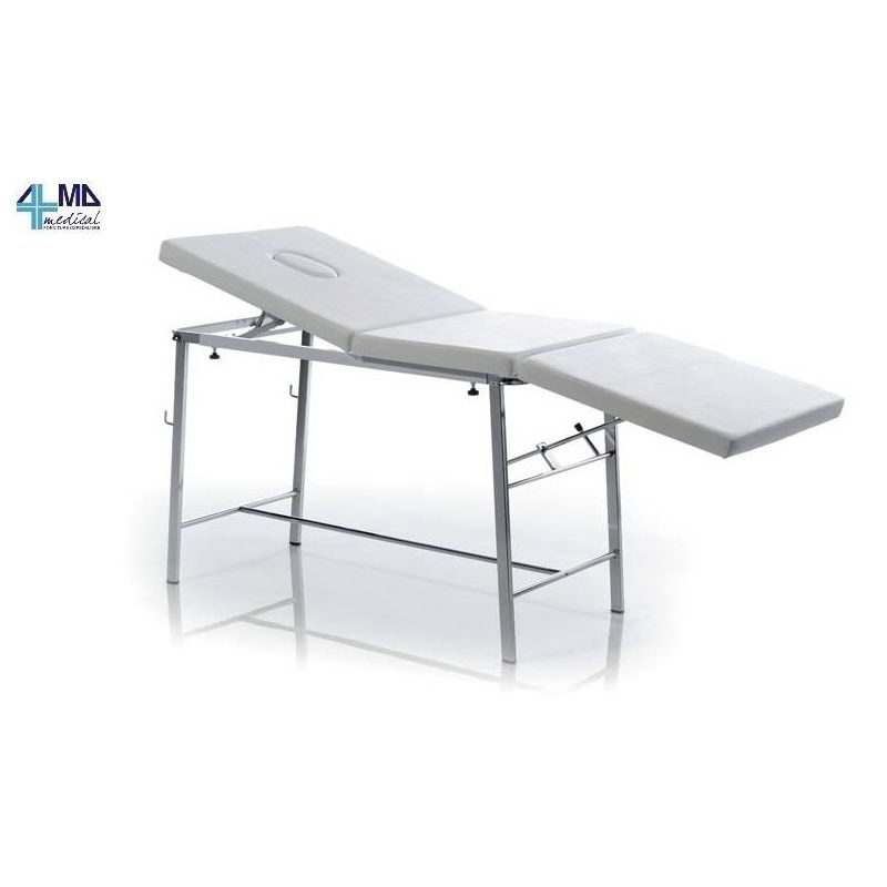 Cama de massagem, metal, cromo, estofado e com buraco facial.