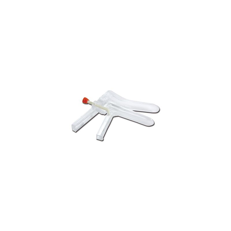 Especulador de parafuso descartável com regulação lateral. É usado para dilatar a entrada da vagina e acessar o colo do útero.