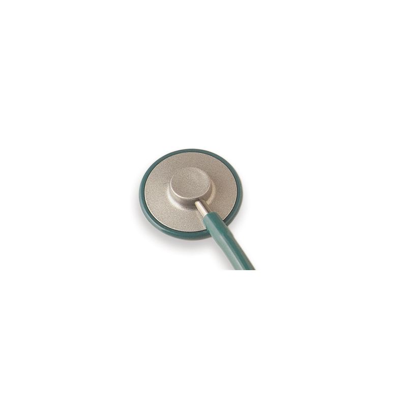 Fonendoscópio adulto com liga de zinco Pavilhão isolante "Duracote", anel anti-frio, arco com mola externa. O pavilhão é verde coordenando com a cor do anel. Embalagem em caixa de papelão.