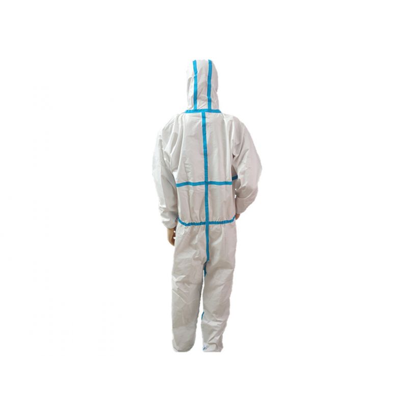 Microporosa respirável, não tecido, capuz, costuras seladas, punhos elásticos, cintura elástica, zíper frontal.