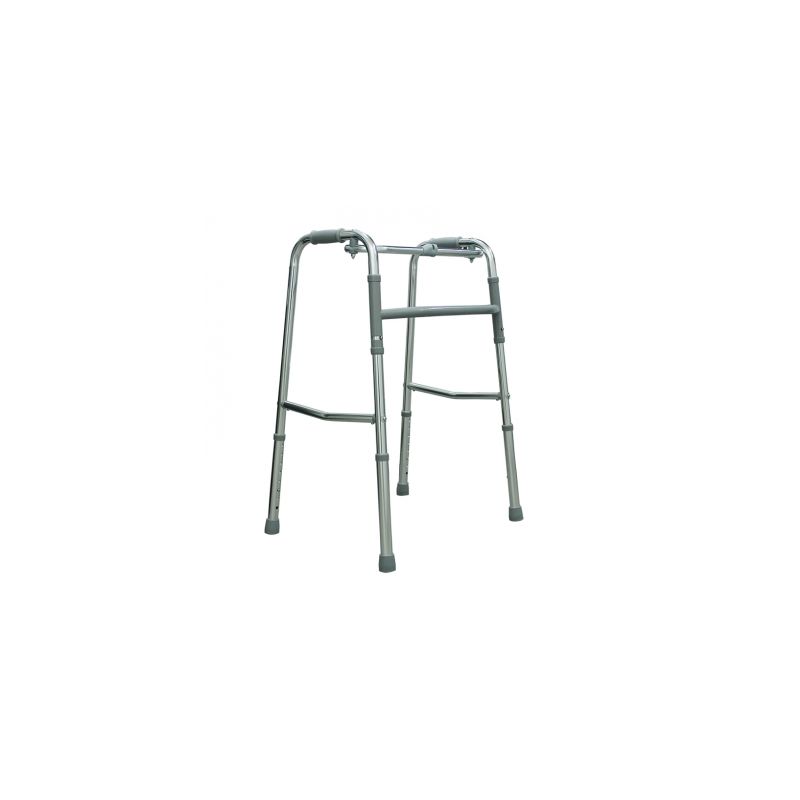 Caminhada dobrável com estrutura de alumínio, ajustável em altura, haste de estabilização horizontal de aço e quatro pontos de apoio no chão.