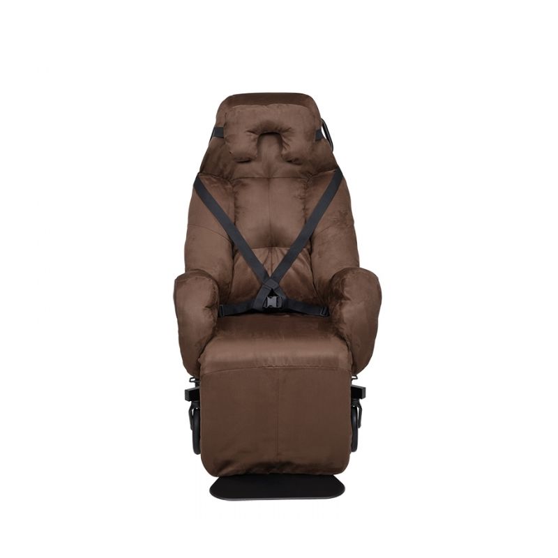 Está equipado com um sistema de freio de pedal, acessível a partir de três lados da cadeira (lateral e traseira).Cacao (outras cores disponíveis a pedido).