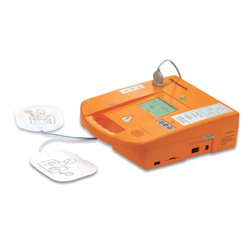 Defibrillator semi automático, com monitor e bateria recarregável.