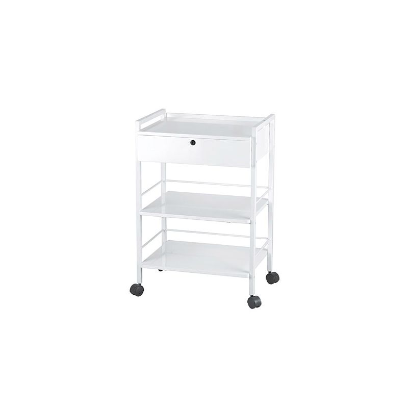 Quadro metálico de cor branca com uma gaveta chave e 3 prateleiras projetadas para acomodar dispositivos de sobreposição ou armazenar vários acessórios de centros de beleza.