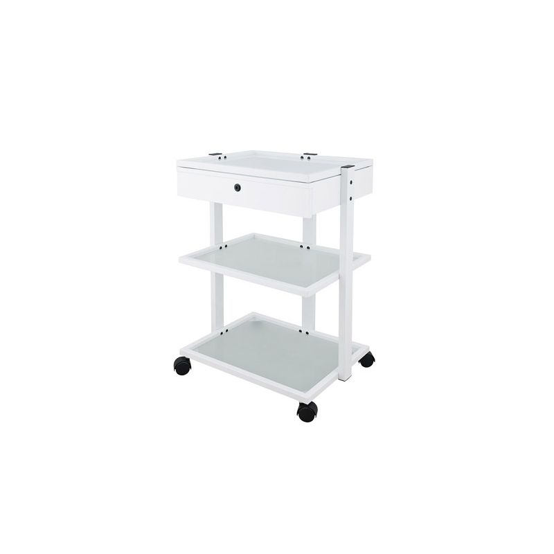 carrinho branco com design de estrutura de metal prático com uma gaveta chave e 2 grandes prateleiras de vidro translúcido para a instalação de instrumentos.