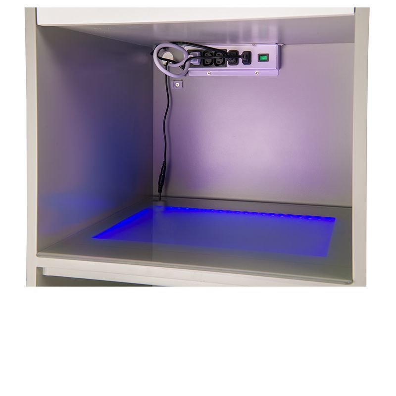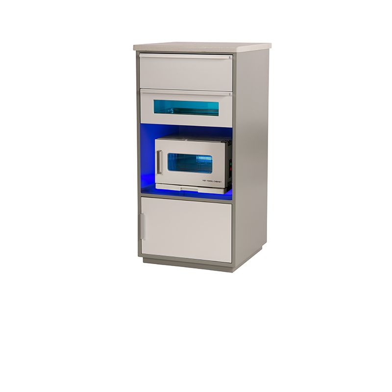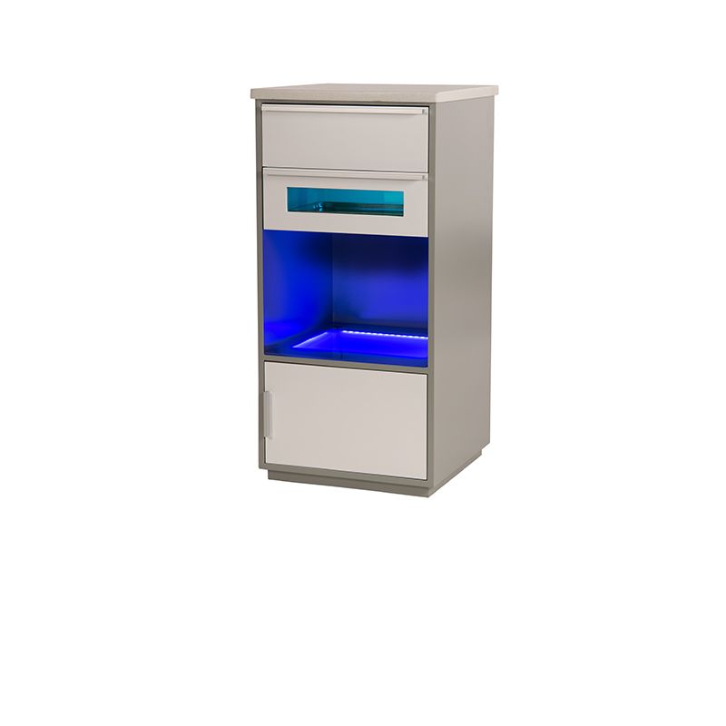 Móveis multifuncionais de madeira cinza com superfície composta por quartzo e resina bege. Com gaveta UV.