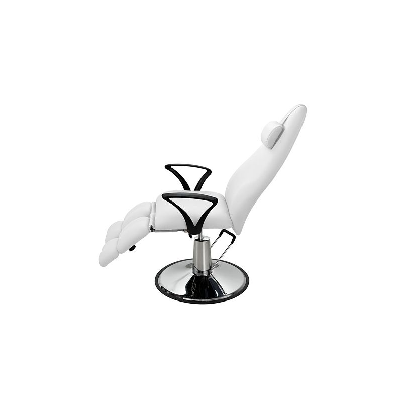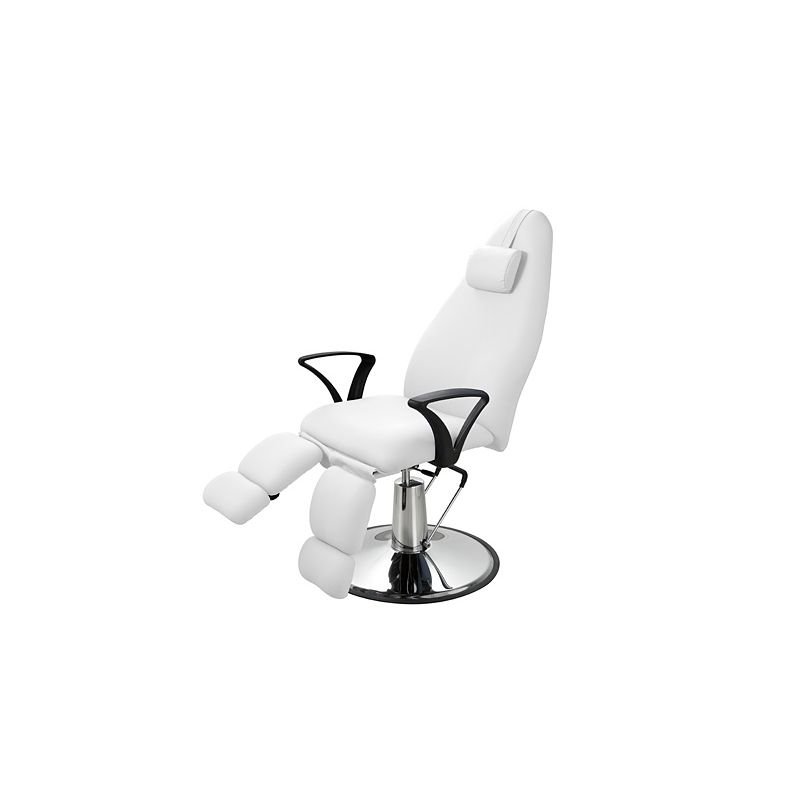 Cadeira de podologia rotativa com base cromada. Altura ajustável da bomba hidráulica com sistema de bloqueio. Braço e altura da perna independentemente ajustável com pistão de gás. Fita em PVC branco sem costuras de alta qualidade e fácil de limpar.