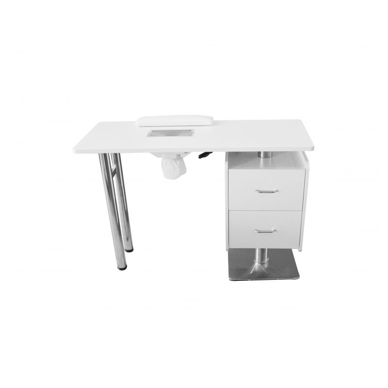 Elegante mesa de manicure de madeira compensada branca com aspirador de pó, saco e almofada.