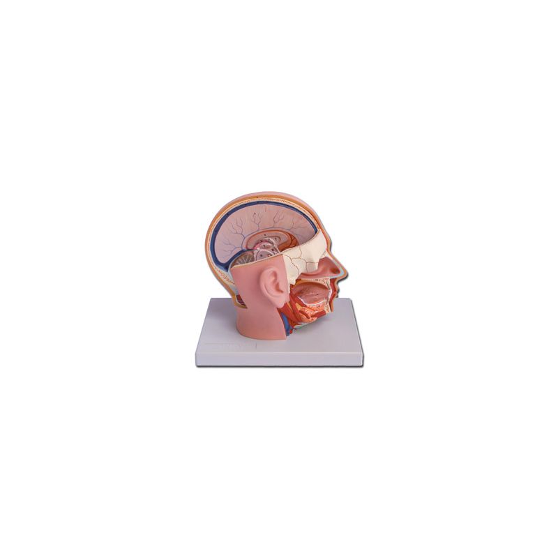 Den högra sidan av ansiktet är utformad i sagital och horisontell sektion, vilket visar många betydande interna funktioner i skallen och hjärnan, liksom hela oronasal hålighet.