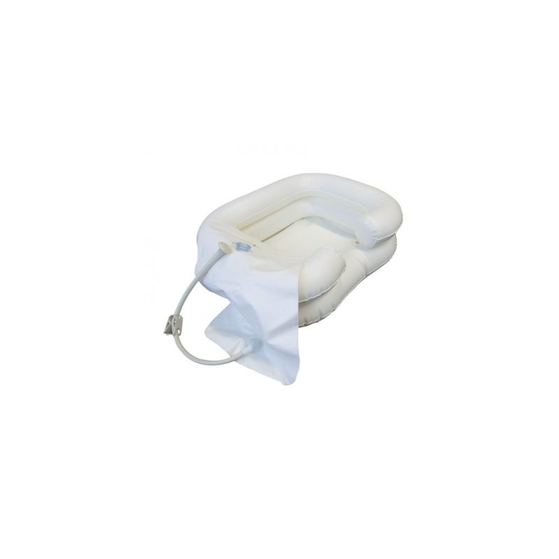 Hårtvätt kit består av en liten uppblåsbar handfat med dräneringssystem för vatten, plus en väska med röret.