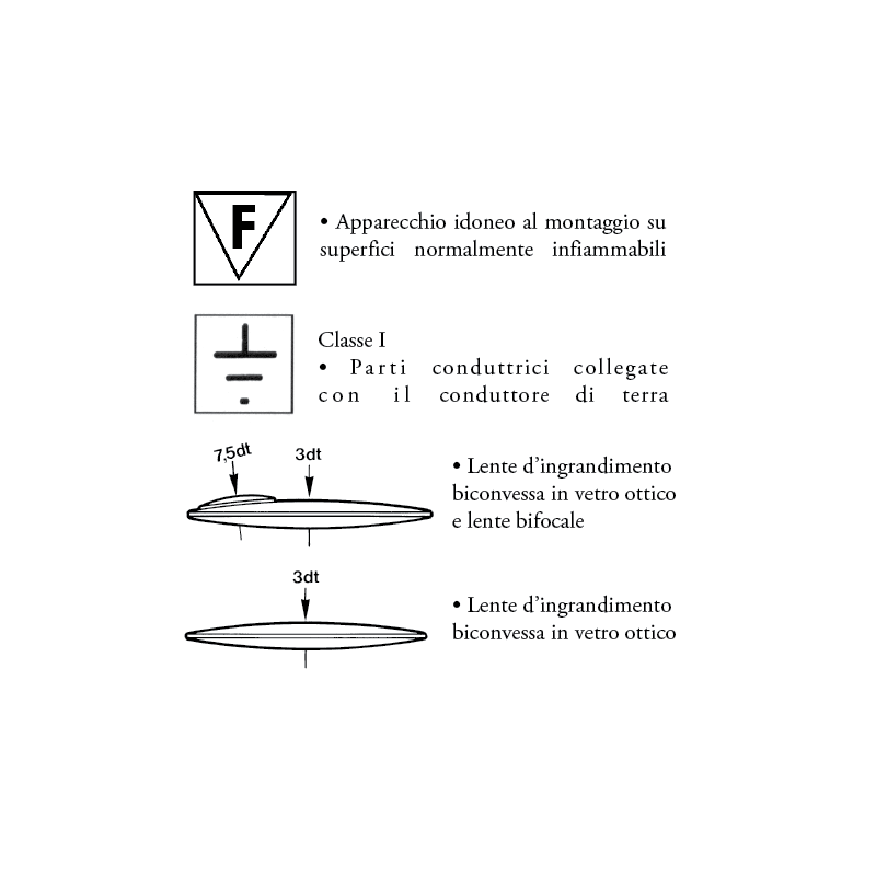 Lampa med bifokal lins 3 + 7,5dt liten och utan stöd. Projektor med full biconvex optisk förstoringsglas med en 22W fluorescerande glödlampa, skyddad av en sista minuten display. Med 24V elektronisk kula, kraftkabel och plug.